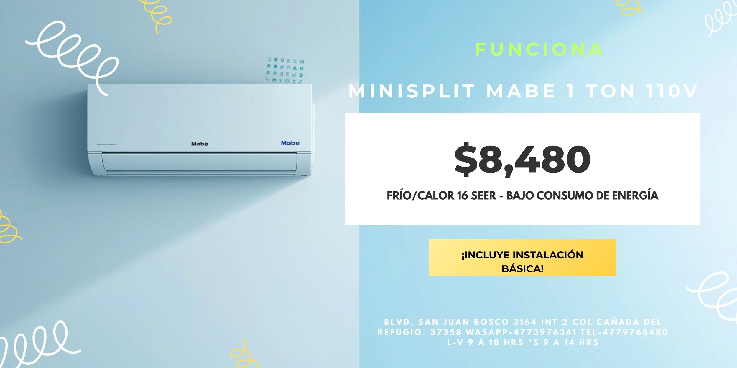 Equipo Mabe 17.5 SEER, amigable en consumo de energia electrica, tuberia interna de cobre, filtros de alta densidad, 2 años de garantia en equipo. Pregunta por opciones de instalacion y mantenimiento.